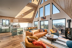 The fully stocked kitchen makes mealtime easy, while the laundry room keeps your gear ready for the next outing. Natural light floods the open-concept living area, where soaring ceilings and wall-to-wall windows frame breathtaking lake and mountain views.